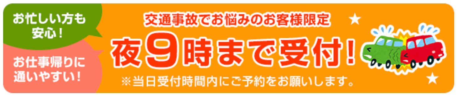 事故に遭ってしまった方、通院中でも効果を感じられていない方、その他交通事故に関して不安をお抱えの方など、お気軽にご相談ください。